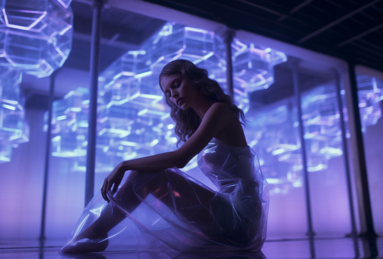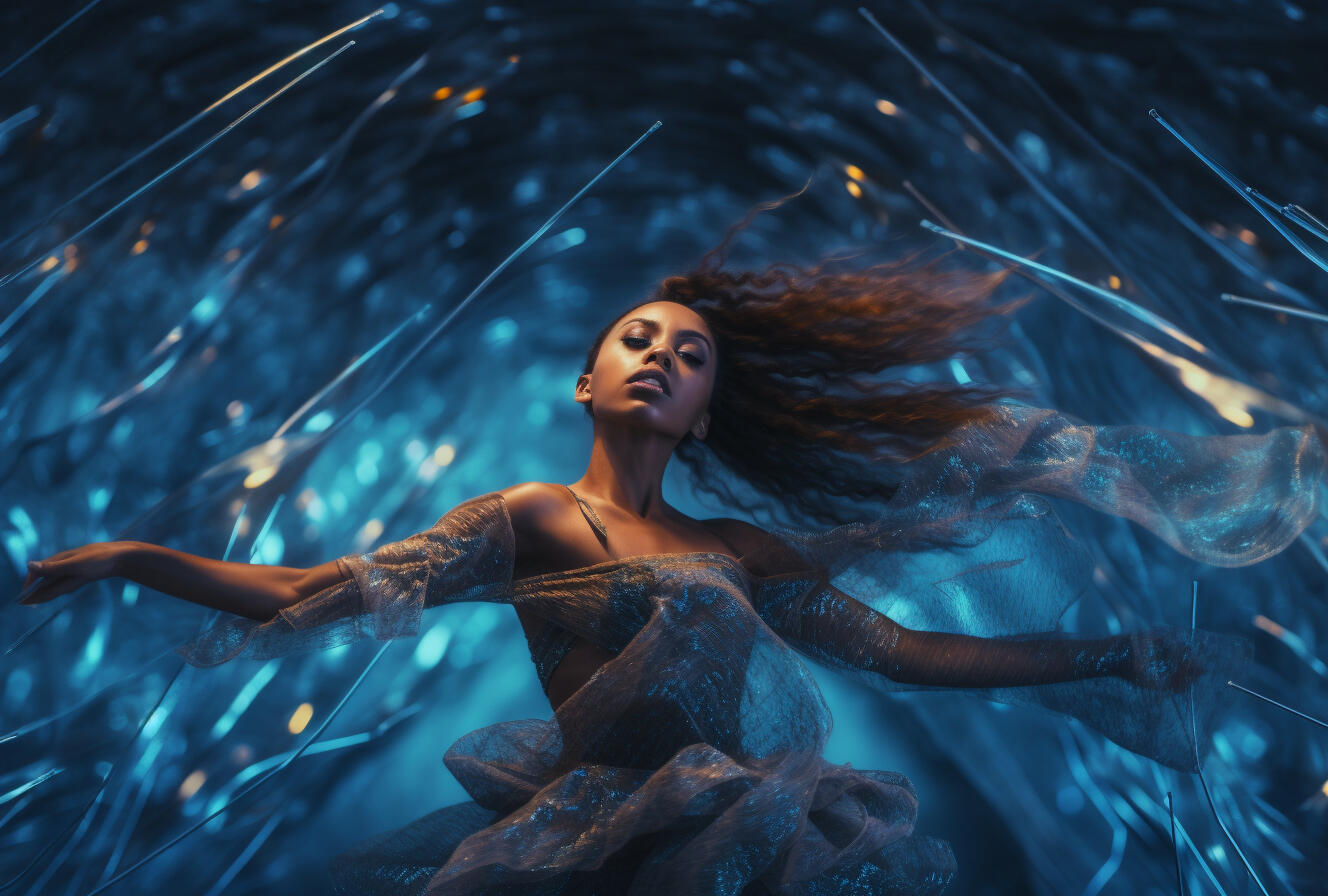 inspired by my late aunt, rosita balthazar who ran the belizean dance company, this series explores the concept of ai choreography and ballet costume. my work often deals with the relation between human and computer interaction and the beauty that lies within creative collaboration with technology. the lighting treatment in this series is meant to evoke the neon lights of subways, car indicator lights, and cats eyes on the road. these types of lights are usually liminal and unnoticeable in the background as they purely serve a purpose to help us see in the dark.the materials are inspired by the bio materials that designers are using now, which often carry the aesthetic values of plastics but bring us back to nature and resemble jellyfish or undersea creatures. by incorporating these materials, the series reflects the interplay between artificial and organic, highlighting the beauty and fragility of the natural world. the concept explores the transformative power of technology in the realm of dance and costume design, blurring the boundaries between the human body and the digital realm.