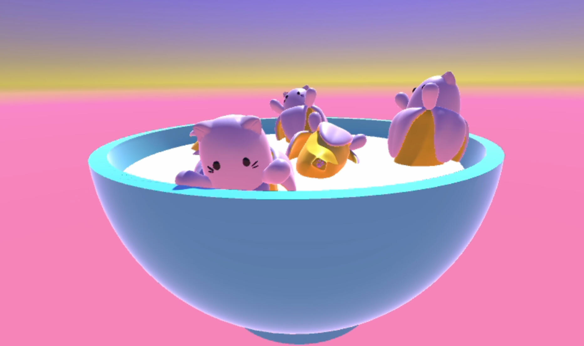 i like cats, and i like bananas. so here are some bananacats. for this project, i explored the world of virtual reality, using a software called unity to create a digital sculpture of bananacats chilling out in a bowl of milk on a pink planet.