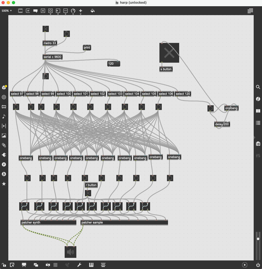 the software is split into three sections. the below image is the main section which controls the serial input and output into my laptop through an arduino. the parts for my laser harp were assembled onto a bread board, connected to an arduino, and programmed in accordance using a software called max. i used light reactive diodes which capture the light coming from the lasers. when the diodes are covered a reaction occurs in the software that triggers the sound. this means that when the lasers light is broken it simulates the reaction of a string being plucked.