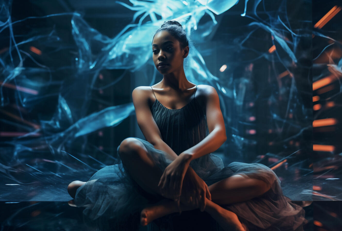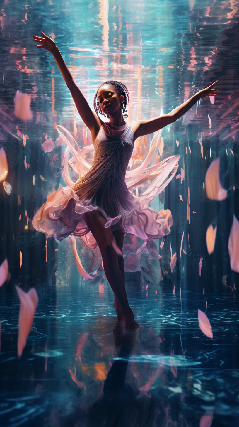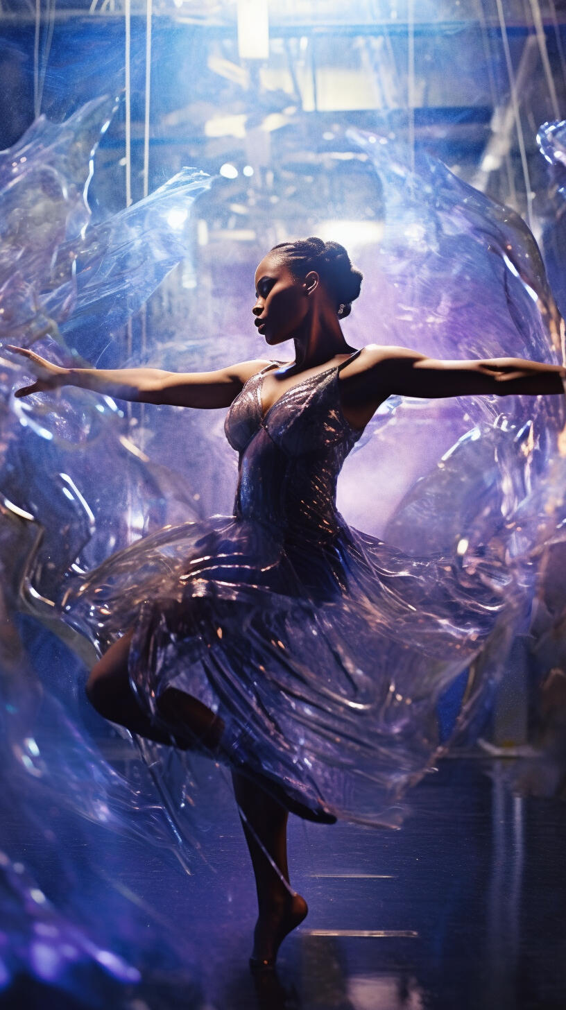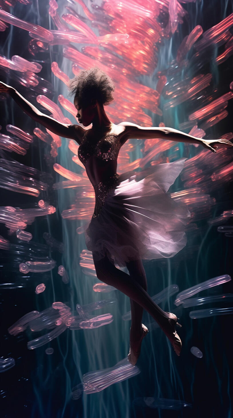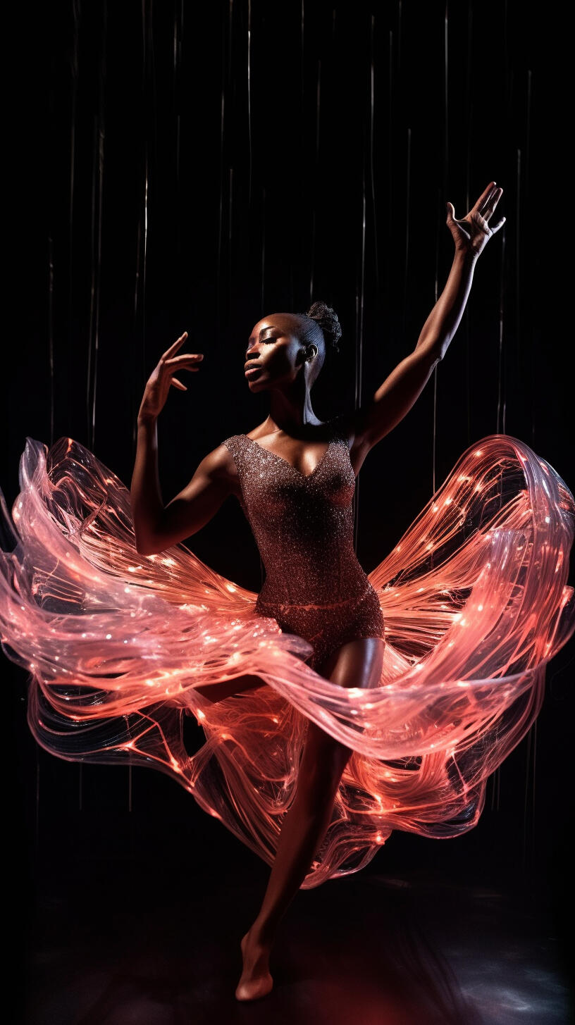 inspired by my late aunt, rosita balthazar who ran the belizean dance company, this series explores the concept of ai choreography and ballet costume. my work often deals with the relation between human and computer interaction and the beauty that lies within creative collaboration with technology. the lighting treatment in this series is meant to evoke the neon lights of subways, car indicator lights, and cats eyes on the road. these types of lights are usually liminal and unnoticeable in the background as they purely serve a purpose to help us see in the dark.the materials are inspired by the bio materials that designers are using now, which often carry the aesthetic values of plastics but bring us back to nature and resemble jellyfish or undersea creatures. by incorporating these materials, the series reflects the interplay between artificial and organic, highlighting the beauty and fragility of the natural world. the concept explores the transformative power of technology in the realm of dance and costume design, blurring the boundaries between the human body and the digital realm.